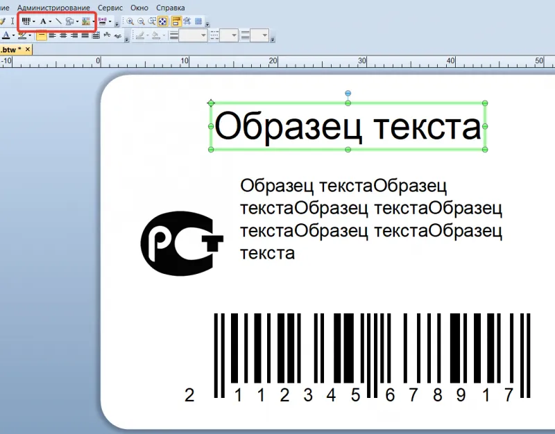 Перед вами откроется чистый шаблон этикетки, добавляя нужные элементы (выделены красной рамкой) и меняя их расположение на шаблоне, можно добиться нужного вам макета этикетки:
